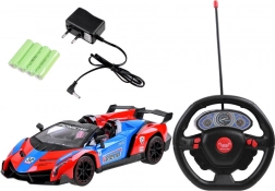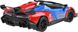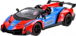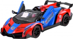 Carrozzeria attraente rosso-blu-nera con linee aerodinamiche, spoiler e dettagli curati. Le porte possono essere aperte direttamente dal telecomando per un’esperienza ancora più realistica.