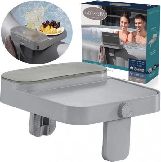 Goditi il relax in vasca idromassaggio senza compromessi – la mensola Bestway 4 in 1 multifunzione per tutti i modelli LAY‑Z‑SPA tiene bevande, telefono, tablet e piccoli oggetti sempre a portata di mano. Offre tavolino, vano portaoggetti resistente agli schizzi, gancio per asciugamani e supporto per tablet in un unico prodotto. Grazie alle ganasce regolabili (5–25 mm) si fissa in modo rapido e stabile al bordo della spa.