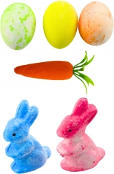 Questo set include uova colorate, coniglietti e carote, conferendo un aspetto classico pasquale.