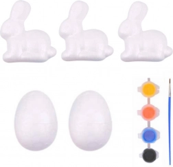Il set contiene tre coniglietti di polistirolo e due uova di polistirolo. Include anche quattro colori vivaci e un pennello che consentono una pittura facile e precisa.