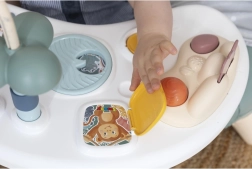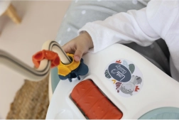 Il vassoio removibile con tre piedini propone numerosi stimoli sensoriali: gioco a scomparsa con canguro, koala rotante su piccola palma, specchio sicuro e pista con perline. Queste attività sviluppano motricità fine, concentrazione e coordinazione occhio–mano, mantenendo il bebè sereno e coinvolto.