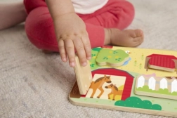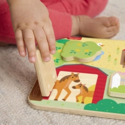 Questa tavola da gioco contiene 4 porte che si aprono per rivelare i vari animali amichevoli e i loro cuccioli. Le dimensioni delle porte sono ideali per le mani piccole, facilitando la manipolazione e favorendo lo sviluppo della motricità fine.