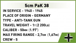 Sono inclusi due minifigure (meccanico tedesco e artigliere), un cannone da campagna 5 cm Pak 38 e un cartello segnaletico EL ALAMEIN ispirato a fotografie storiche. Il set è prodotto nell'UE, conforme alle norme di sicurezza ed è pienamente compatibile con altre marche di mattoncini da costruzione.
