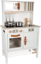 Questa moderna cucina in legno SMALL FOOT Tasty si distingue per la struttura robusta, il pulito look scandinavo e le funzioni studiate per un gioco di cucina realistico. Include lavello in metallo, manopole girevoli con suono meccanico, piano cottura elettronico con effetti luminosi e sonori e pratica cappa estraibile con simbolo luminoso.