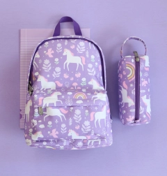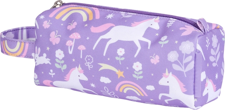 Astuccio viola per matite, pennarelli o articoli di cancelleria con motivi di unicorni, fiori e arcobaleno è realizzato in poliestere sostenibile. Ideale per la scuola, i viaggi o i club, si chiude con una zip e ha un comodo manico per un facile trasporto. Garantisce una conservazione sicura dei tuoi articoli di cancelleria.