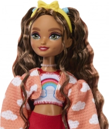 Lunghi capelli mossi castani con cerchietto e fiocco, crop top con arcobaleno, cardigan con nuvolette e gonna rossa: tutto facilmente abbinabile e rimovibile.