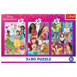 Puzzle 3x80 Disney Principesse Amiche contiene tre puzzle diversi con temi delle principesse Disney. Questa confezione offre divertimento per più bambini, poiché offre tre puzzle da 80 pezzi.