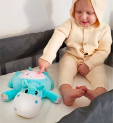 L’ippopotamino di peluche WOOPIE BABY crea prima della nanna un’atmosfera rilassata grazie alla luce soffusa del proiettore e alle ninnananne distensive con suoni della natura. Le lucine cambiano colore in modo graduale e proiettano stelle, luna e pianeti, dando ai bambini una sensazione di sicurezza.