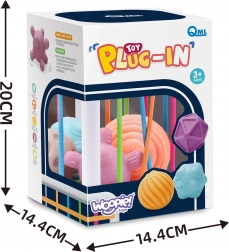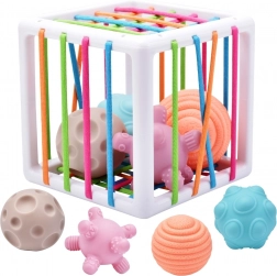 Questo cubo sensoriale con elastici è un aiuto ideale per i bambini che amano scoprire il mondo attraverso il tatto. Le forme morbide con superfici diverse si afferrano facilmente, si possono schiacciare e spingere attraverso le fasce elastiche. Il gioco sviluppa in modo naturale la motricità fine, il tatto e la coordinazione, rafforzando al contempo pazienza e pensiero logico.