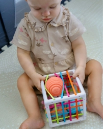 Le fasce elastiche colorate permettono ai bambini di spingere facilmente le forme dentro e fuori, allenando così la presa, la coordinazione e la pazienza.