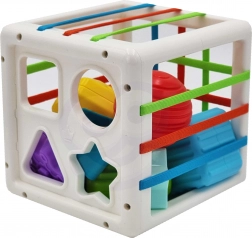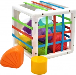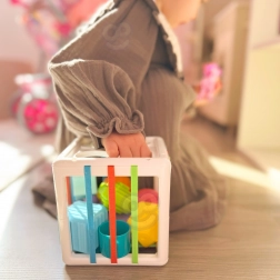 Questo colorato cubo sensoriale combina due attività amate: inserire i pezzi attraverso gli elastici e ordinarli nei fori sagomati. I bambini imparano a riconoscere colori e forme geometriche, sviluppano curiosità e capacità di concentrazione. I pezzi solidi sono facili da afferrare e il cubo ha una costruzione pratica per un comodo trasporto e riordino.