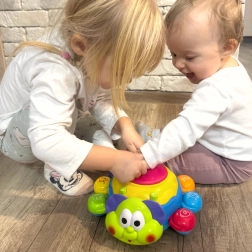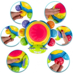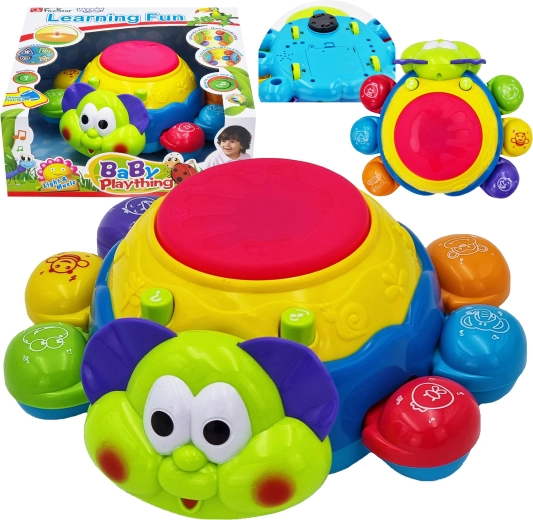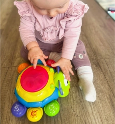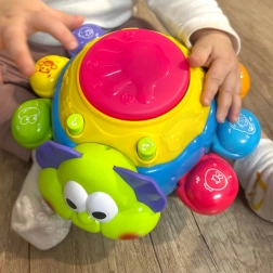 Gli effetti luminosi e sonori si attivano premendo il tamburo sulla parte superiore del giocattolo, favorendo la coordinazione mano-occhio e le capacità cognitive fin dalla tenera età.