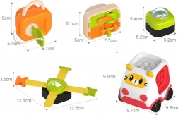 - macchinina gattino + 4 cubi manipolativi (serratura con chiavetta, finestrelle con chiusura/cursore, elemento girevole con palline, cinghie con fibbie e asole)