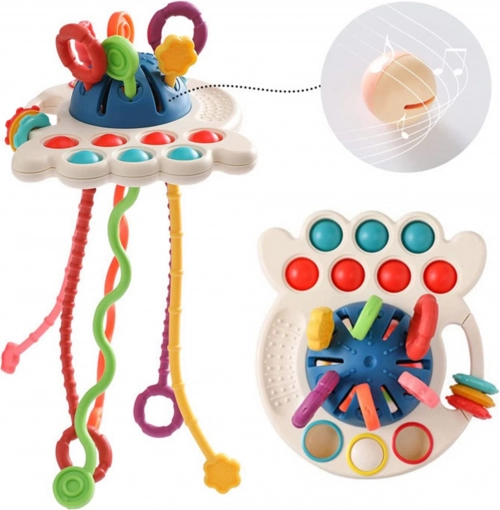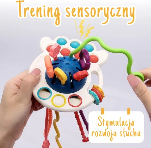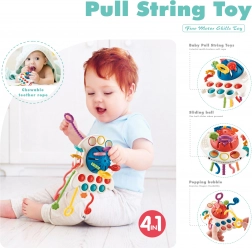 Scopri il giocattolo sensoriale multifunzionale e massaggiagengive ispirato al metodo Montessori, che sostiene lo sviluppo dei sensi, la motricità fine e offre sollievo durante la dentizione. Le cordicelle da tirare colorate con diverse texture, gli elementi rotanti e le bolle pop invitano ad afferrare, tirare ed esplorare, mentre i materiali sicuri e la facile manutenzione faranno felici i genitori.