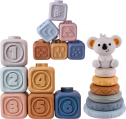- Set sensoriale 3in1: anelli impilabili, cubi morbidi, massaggiagengive