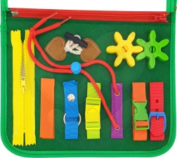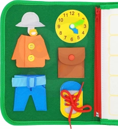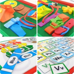 - 6 strati con diverse attività. Ogni strato offre compiti unici, come l'apprendimento dei colori, dei numeri, dell'alfabeto, delle forme geometriche, delle ore, dei giorni della settimana, delle storie e l'allacciatura dei bottoni.