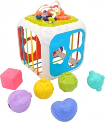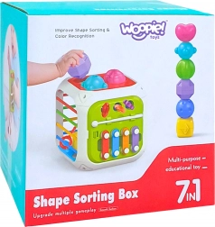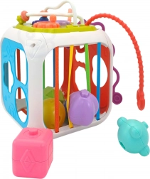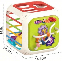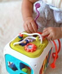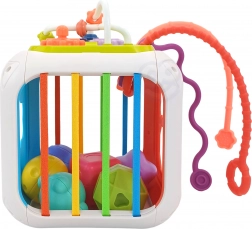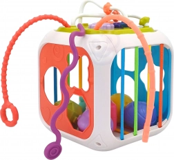 Il cubo è realizzato in plastica ABS e silicone di qualità, resistente e sicuro per le manine dei bambini. Sono incluse anche forme di classificazione con campanellini nascosti, che invogliano a sperimentare suono, forme e colori. La parte superiore removibile amplia le possibilità di gioco – il bambino può usarla separatamente su una superficie o nel passeggino.