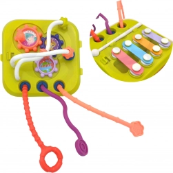 Il cubo attivo WOOPIE è un giocattolo educativo ben congegnato che, in una forma compatta, offre numerose attività per l’esplorazione quotidiana. Dal pannello superiore rimovibile con mini xilofono, agli ingranaggi e al labirinto con perline, fino alle cordicelle testurizzate – ogni lato offre uno stimolo diverso per lo sviluppo della coordinazione mano–occhio, la concentrazione e la creatività.