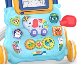 Il girello contiene anche un set di blocchi di diverse forme con immagini di animali, introducendo così il gioco di apprendimento di forme, colori e animali. L'ingranaggio mobile rotante si muove quando viene manipolato dal bambino, portando un elemento di sorpresa.