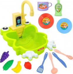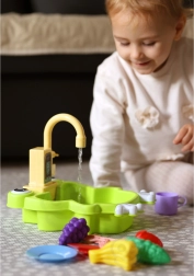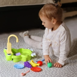 Il set include ricchi accessori: stoviglie, posate, boccetta per il “detersivo”, frutta e verdura. Il gioco favorisce la percezione sensoriale, la coordinazione occhio–mano e il gioco creativo. Il set è realizzato in plastica resistente con bordi lisci per un uso sicuro.