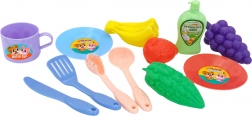 Piatti, tazza, posate, frutta e verdura e boccetta per il “detersivo”: tutto ciò di cui ha bisogno il piccolo aiutante in cucina.