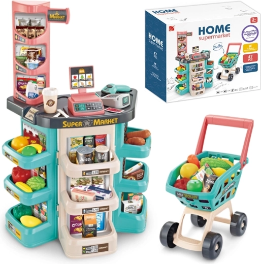 Supermercato per bambini con carrello e 47 accessori del marchio affidabile Woopie è ideale per bambini da 3 anni. Questo set giocoso sviluppa la loro fantasia e creatività.