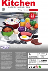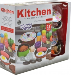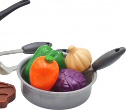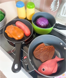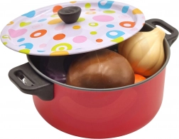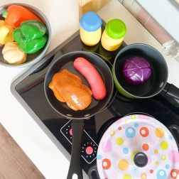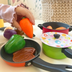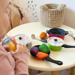 Pentole con coperchi, padellina e ingredienti colorati permettono ai bambini di imitare la cucina vera, sviluppando fantasia e motricità fine.