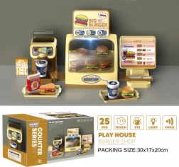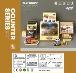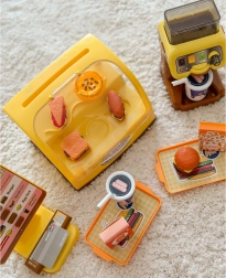 Il set include 25 pezzi tra cui hamburger, patatine, sandwich, bicchieri con cannucce, vassoi, schermo menu e un dispenser di bevande in cui è possibile versare acqua e davvero “riempire” i bicchieri. Gli accessori colorati in plastica sono leggeri e ideali per i giochi di ruolo – addetto al banco, cuoco e cassiere.