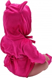 La bambola indossa un grazioso abitino rosa con design di orsetto e cappuccio, offrendo un aspetto giocoso e attraente.