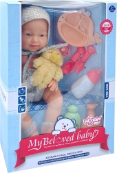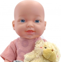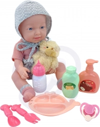 Il set include tutto ciò di cui i piccoli caregiver hanno bisogno: bambola vestita, ciuccio, orsetto, biberon e set pappa (piattino, forchettina, cucchiaino), completati da due flaconi “cosmetici” per scenari di bagnetto e cura. La bambola ha arti mobili morbidi in gomma e un corpicino in plastica senza imbottitura in peluche.