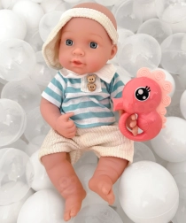Bambola, ciotolina/piattino, cucchiaino e forchettina, succhietto con cordicella, giocattolo a forma di cavalluccio marino