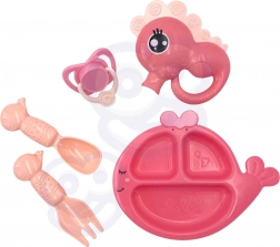 Il set include piattino con scomparti, posate, succhietto con cordicella e altri accessori che trasformano il gioco in una vera cura.