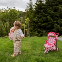 La dotazione pratica include capottina pieghevole parasole, poggiapiedi, cinture di sicurezza e ampio cestello per gli accessori della bambola. Le ruote in schiuma sono delicate sul pavimento e offrono una buona aderenza. Al termine del gioco, il passeggino si ripiega facilmente e si ripone senza occupare troppo spazio.