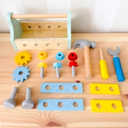 Il set di attrezzi in legno per bambini offre un gioco divertente ed educativo con cui i piccoli possono sperimentare le basi del fai-da-te. Gli strumenti realistici (martello, cacciavite e chiave), le viti, i dadi, gli ingranaggi e le tavolette si possono avvitare e fissare ai fori della cassetta – ciò favorisce il pensiero logico e la comprensione di meccanismi semplici.