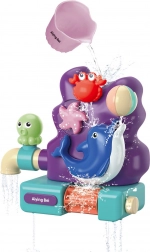 Fissate il pannello con gli animaletti marini tramite 3 ventose su una superficie liscia della vasca o delle piastrelle e il divertimento può iniziare. Dopo aver versato l'acqua nel serbatoio superiore, il flusso si avvia passando attraverso il granchio, fa ruotare la stella marina e vicino al delfino attiva il mulino ad acqua e il rubinetto laterale, che crea una piccola fontana.
