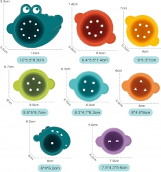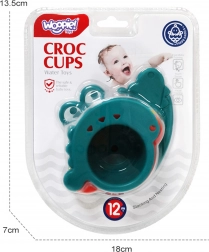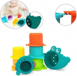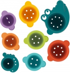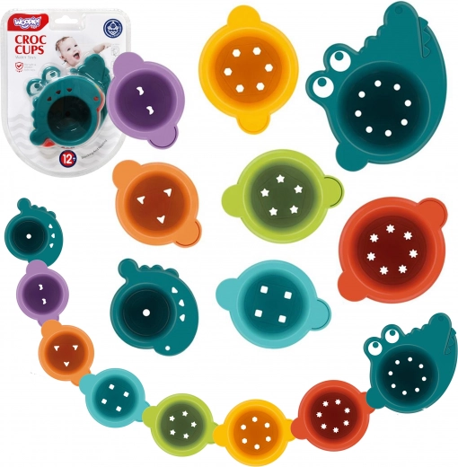 I bicchierini si possono inserire uno nell’altro, impilare in una torre alta oppure collegare lateralmente in un lungo “codino”. Uno dei bicchierini ha il simpatico aspetto di un coccodrillo, che aggiunge ancora più divertimento al bagnetto. I colori vivaci e le forme dei fori aiutano nell’apprendimento dei colori e delle forme geometriche.