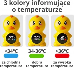 Scala cromatica intuitiva: blu = meno di 34 °C, verde = 34–36 °C, rosso = più di 36 °C. L’ergonomica forma a paperella è a misura di bambino e sicura per l’uso in acqua. Un aiutante ideale per il bagnetto quotidiano e i giochi acquatici estivi.