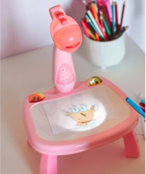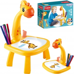 Il tavolino da disegno con proiettore a forma di giraffa proietta motivi colorati direttamente sulla superficie del tavolo o sul foglio inserito. I bambini scelgono il soggetto, accendono il proiettore e ricalcano facilmente i contorni – imparando a disegnare passo dopo passo. La superficie è cancellabile a secco, quindi i disegni si rimuovono con la spugnetta inclusa e si può creare ancora e ancora.