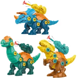 - 3 dinosauri da assemblare – pezzi colorati, viti e snodi mobili.