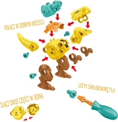 Nella confezione sono inclusi un trapano per bambini con funzione di rotazione in entrambe le direzioni per avvitare e svitare, accessori intercambiabili, un cacciavite e pezzi resistenti per assemblare tre diversi dinosauri. Il tutto si ripone comodamente nella pratica valigetta, ideale per i viaggi e per tenere in ordine.