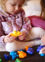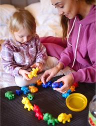 Genitori e figli possono giocare insieme con giocattoli di plastica colorati e connettibili a forma di unicorni, favorendo lo sviluppo delle capacità di coordinamento.