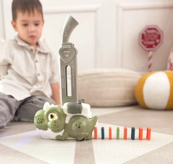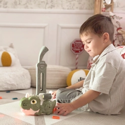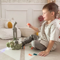 Il divertente giocattolo Woopie unisce una locomotiva a dinosauro e la posa automatica delle tessere del domino in un unico set interattivo. Grazie a effetti luminosi e sonori entusiasma i bambini e mantiene alta l’attenzione, sviluppando la motricità fine e la fantasia. Basta riempire il caricatore con le tessere del domino, avviare il trenino e guardarlo mentre crea una pista colorata.