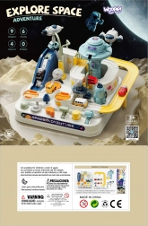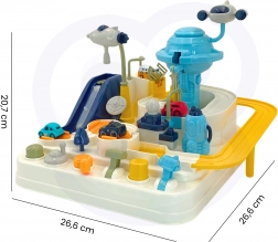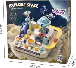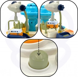Un’ambientazione a tema con rampe, piattaforma girevole e lanciatore dei veicoli offre partenze dinamiche e missioni nello spazio.