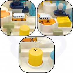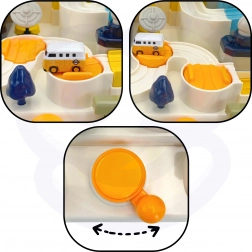 Leve, pulsanti e manopole mettono in moto l’intera pista. Il bambino allena motricità fine, coordinazione e concentrazione in modo puramente manuale.