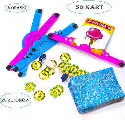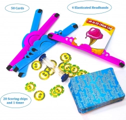 50 carte, 4 fascette, 20 gettoni, 1 clessidra