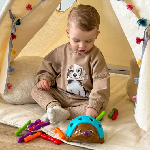 Il simpatico riccio di WOOPIE sviluppa la motricità fine, la coordinazione occhio–mano e il riconoscimento di colori e numeri. I bambini inseriscono gli “aculei” colorati nei fori numerati del guscio, allenando la presa e la precisione. Dopo il gioco, tutti i pezzi si ripongono facilmente nella pancia del riccio – riordino veloce e ordine senza sforzo.