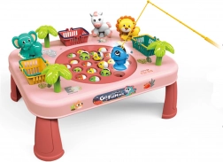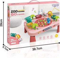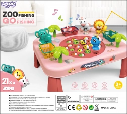 - 1 tavolino di gioco, 4 gambe, 3 canne da pesca, 3 cestini, 21 pesciolini, 3 figure di animali, 3 palme, adesivi