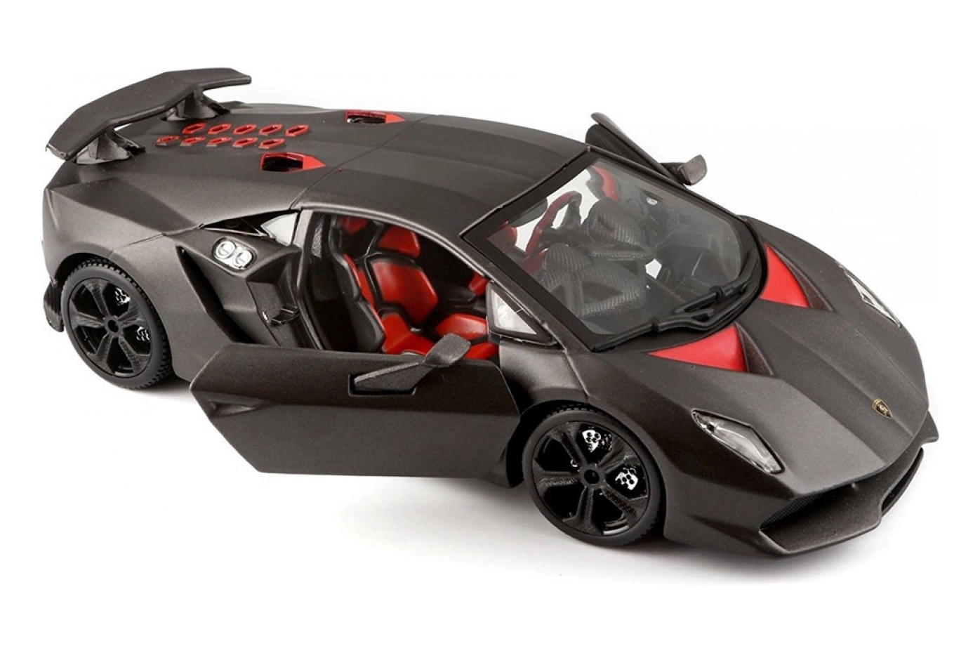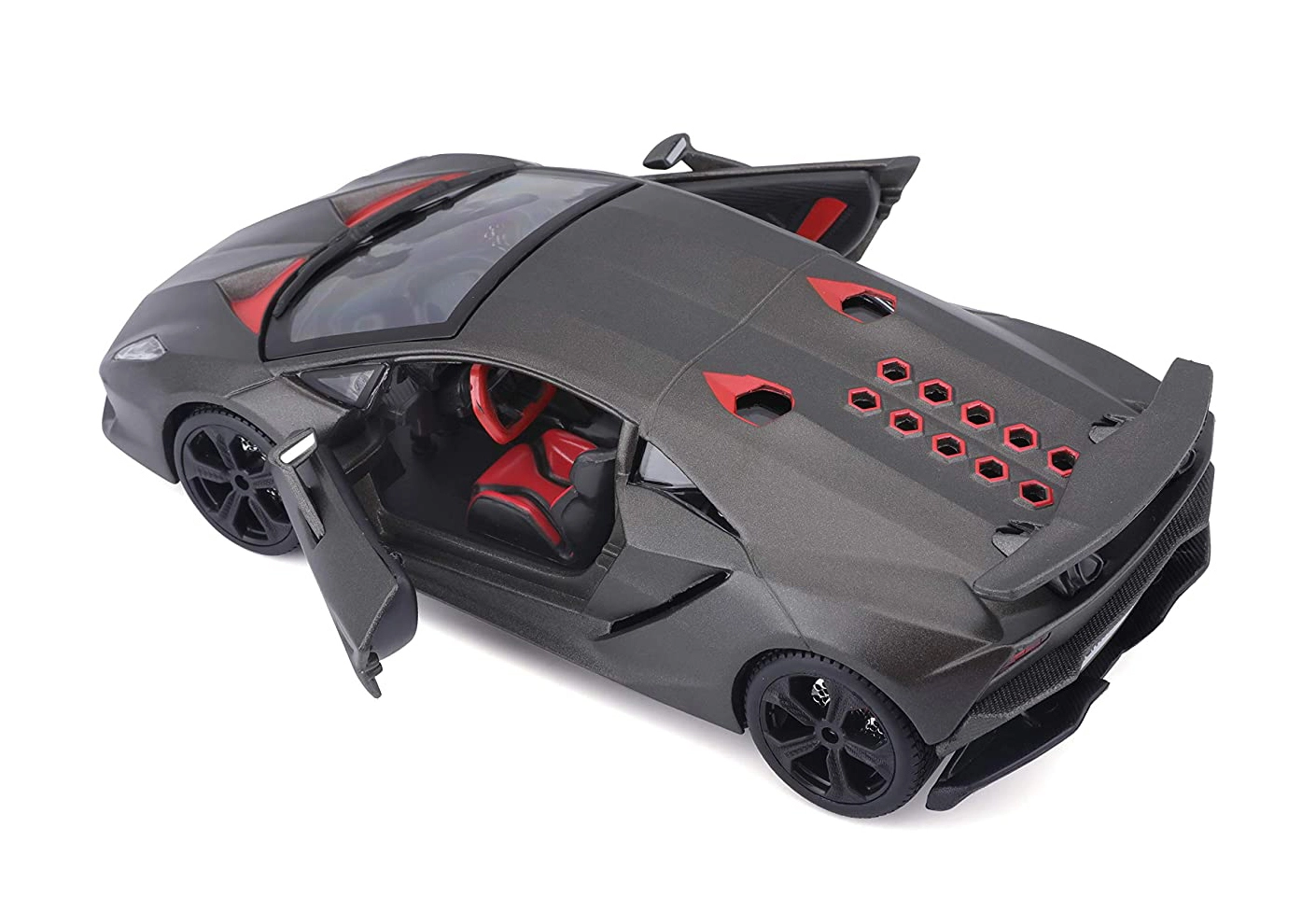 Osserva l’abitacolo nero-rosso con dettagli precisi di sedili, cruscotto e volante: ideale per l’esposizione e il gioco.