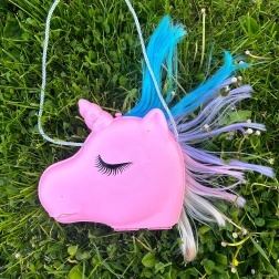 La compatta borsetta unicorno, una volta aperta, si trasforma in un mini salone di bellezza con specchietto e scomparti organizzati per gli accessori.