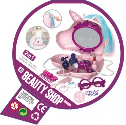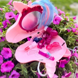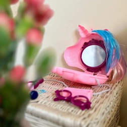 Questo set magico unisce borsetta e toeletta in un unico prodotto. All’apertura compaiono lo specchietto e gli accessori organizzati per giocare al parrucchiere e al trucco. I bambini possono pettinare la criniera colorata dell’unicorno, adornarsi con anellini o occhiali e “asciugare” i capelli con il “phon” – tutto in sicurezza come gioco di finzione.